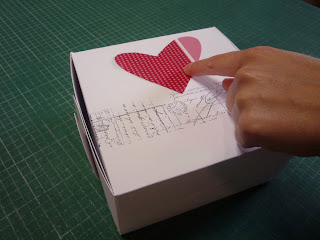 Glue the back of the heart to stick it on the box’s lid, just above the stamp pattern.