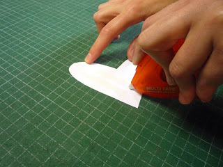 Then, we cut the heart we drew previously on the patterned paper. The pattern and the heart design is up to the look you want to obtain. We’ve drawn a heart on a red and pink pattern and in an irregular way, we’ve avoided the typical rounded heart. Test your originality!