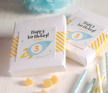 Surprise the littlest one in the family with the coolest little birthday box. A small, pretty white box, decorated with washi tape with yellow and white stripes and a fun personalised card. A buggy with your child's name and age.