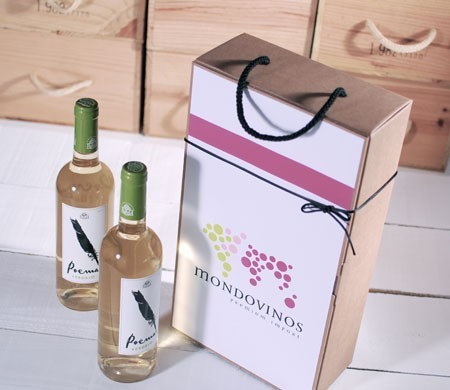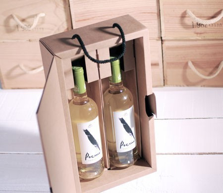 Cardboard box for 2 bottles with handle. If your order is minor than 500 units and we can't give you an estimate for screen-printing, try to glue a sheet of paper with your company logo on the lid of the box and you'll see an amazing result.
